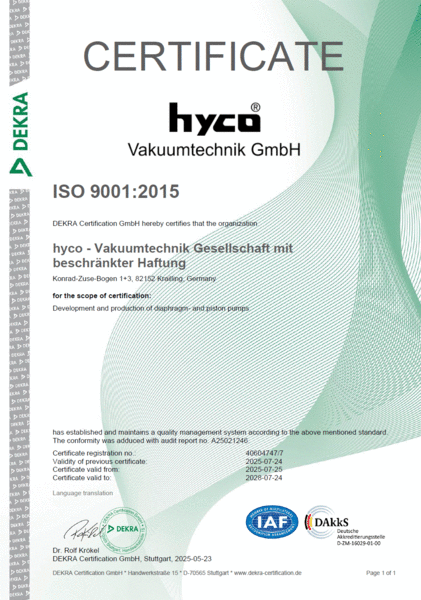hyco Vakuumtechnik is certified per ISO 9001 and undergoes an annual audit process. That is our minimum standard whilst striving to target and obtain the highest standard of customer satisfaction through continuous improvements, further developments and error prevention.